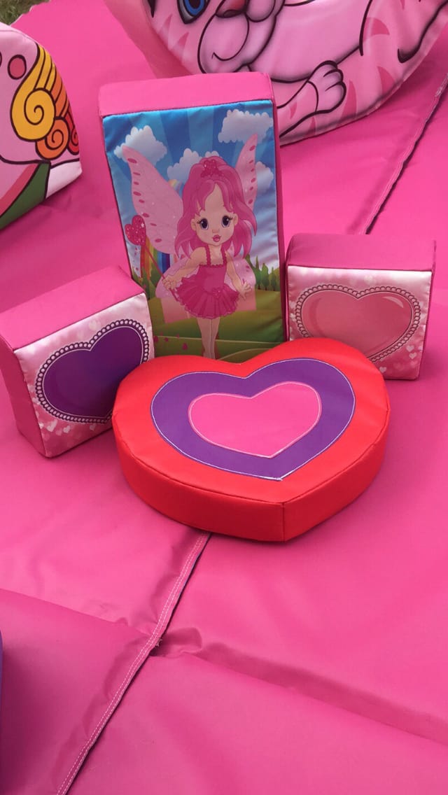 This beautiful girlly soft play set is all chosen and some designed by ourselves using our own little girl for inspiration, we love the popular unicorn theme but wanted to take it one step further by designing a pink striped zebra including a pink bow, a giraffe with pink markings and pink bows in her hair, unicorns, pretty pinks and purples on soft play shapes, hearts and even a fairy!